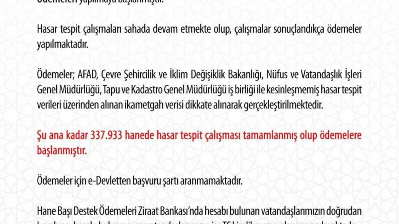 "Kahramanmaraş’ta meydana gelen 7,7 ve 7,6 büyüklüğündeki iki depremin ardından konutları hasar gören vatandaşlarımıza yönelik 10 bin TL tutarındaki Hane Başı Destek Ödemeleri yapılmaya başlanmıştır. Hasar tespit çalışmaları sahada devam etmekte olup, çalışmalar sonuçlandıkça ödemeler yapılmaktadır. Ödemeler; AFAD, Çevre Şehircilik ve İklim Değişiklik Bakanlığı, Nüfus ve Vatandaşlık İşleri Genel Müdürlüğü, Tapu ve Kadastro Genel Müdürlüğü iş birliği ile kesinleşmemiş hasar tespit verileri üzerinden alınan ikametgah verisi dikkate alınarak gerçekleştirilmektedir. Şu ana kadar 337 bin 933 hanede hasar tespit çalışması tamamlanmış olup, ödemelere başlanmıştır. Ödemeler için e-Devlet’ten başvuru şartı aranmamaktadır. Hane Başı Destek Ödemeleri Ziraat Bankası’nda hesabı bulunan vatandaşlarımızın doğrudan hesabına, hesabı bulunmayan vatandaşlarımızın ise TC kimlik numaralarına yapılmaktadır."