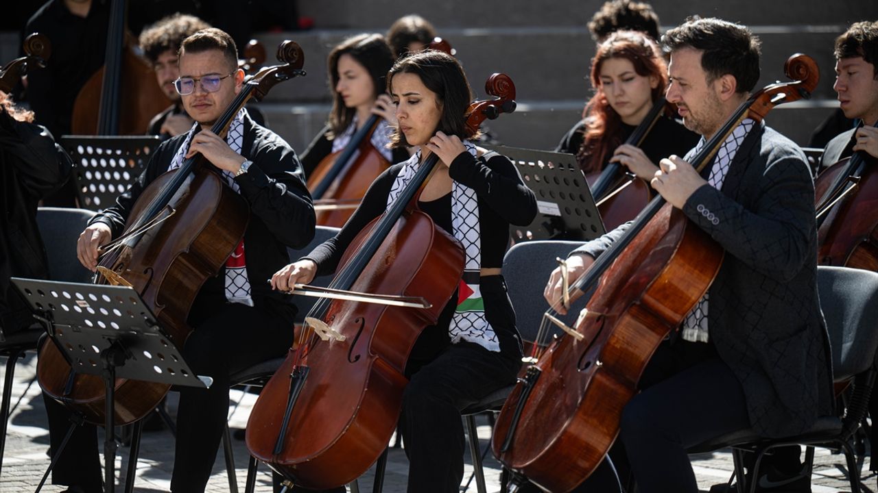 Programın ardından üniversitenin tüm birimlerinden oluşan yaklaşık 500 kişilik orkestra ve koro, Yunus Emre Sevgi Meydanı'nda 'Can Filistin' adlı eseri canlı seslendirdi.