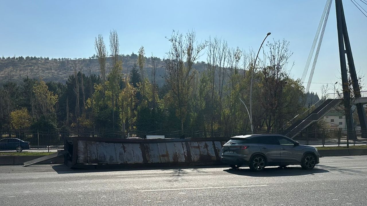 Özal Bulvarı'nda sürücüsünün kimliği henüz belirlenemeyen 06 EDN 293 plakalı seyir halindeki tır, virajı alamadı. Bu sırada kapağı açılan tırın dorsesi yol kenarına devrildi.