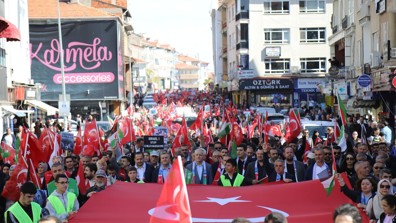 Cami Kebir önünde toplanan vatandaşlar, ellerinde Türk ve Filistin bayraklarıyla Hükümet ve Atatürk Caddesi üzerinden yürüyerek Atatürk Parkı'na ulaştı.