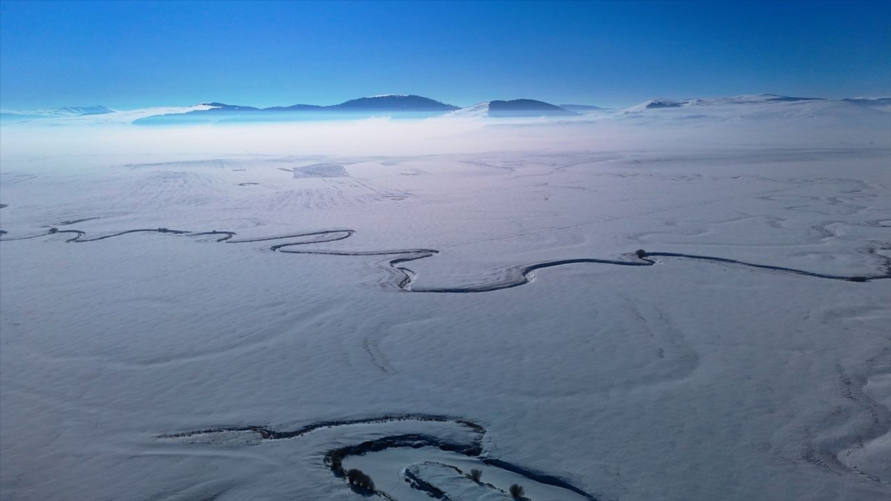 Göle ilçesinin Ova bölgesinde buzla kaplanan menderesler, dronla görüntülendi.