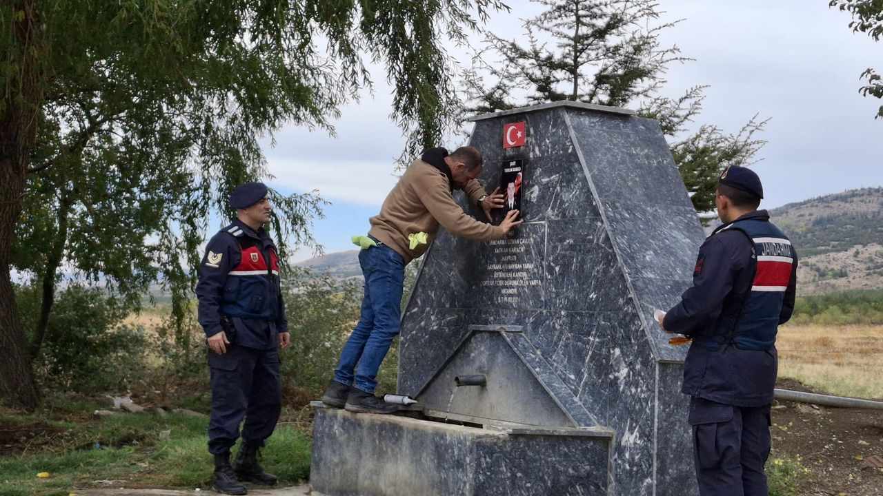 Eskişehir Valiliğinin talimatı üzerine yetkililer, çeşmenin üzerine şehit Jandarma Uzman Çavuş Tarkan Karaca'nın fotoğrafı ile Türk bayrağını yeniden yapıştırdı.