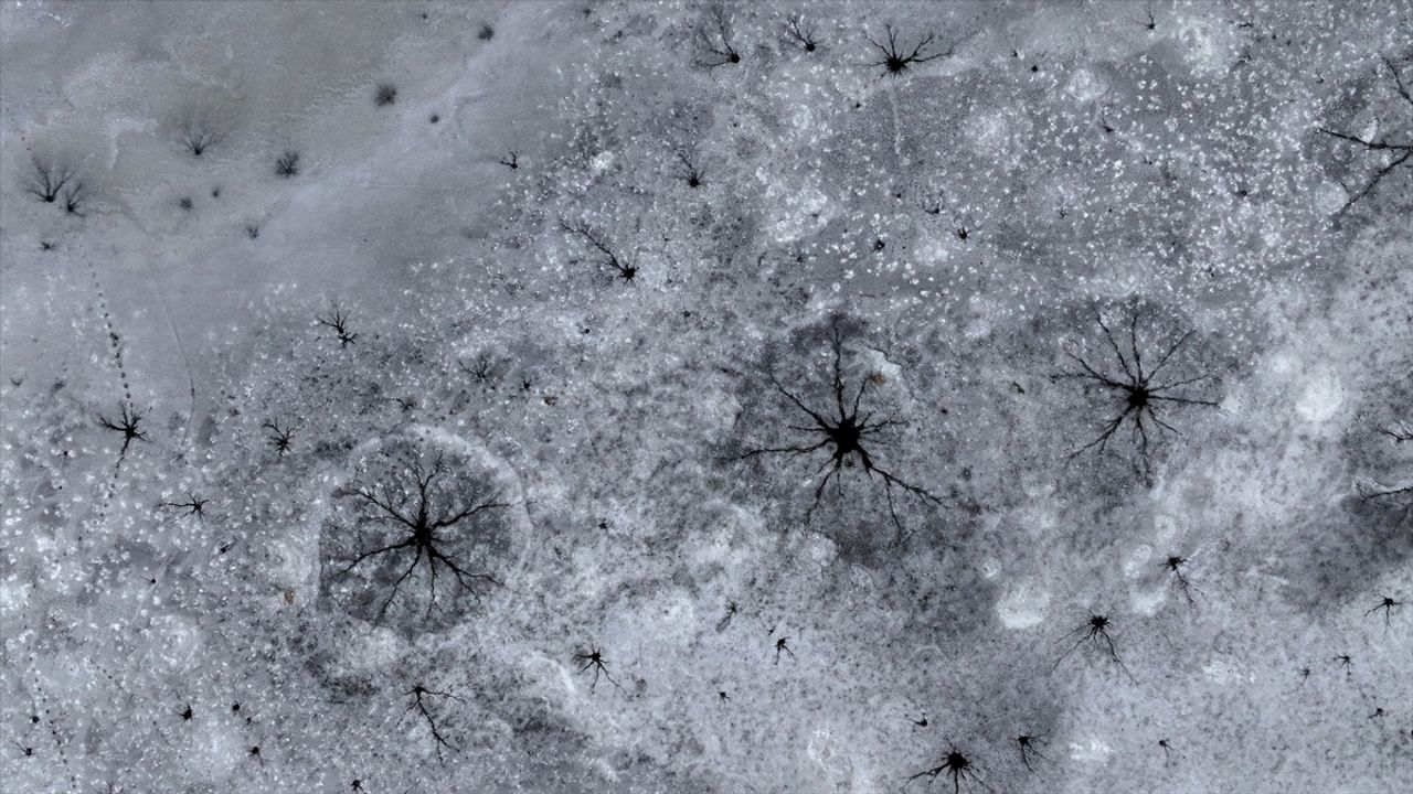 Dronla kaydedilen görüntülerde, göl yüzeyinde oluşan halka şeklindeki buz yapıları ve merkezlerinden yayılan çatlaklar dikkati çekti.