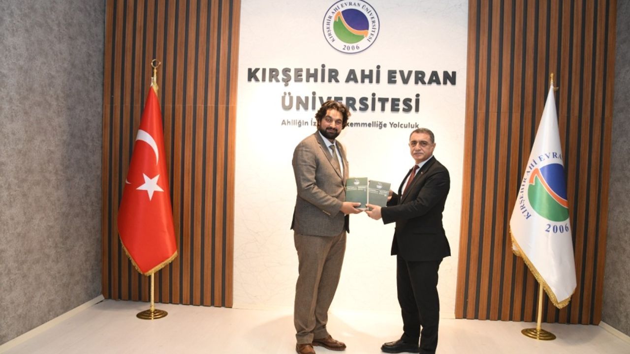 Ahilik Kültürünü Araştırma ve Uygulama Merkezi Müdürü Dr. Öğr. Üyesi Tahsin Hazırbulan ve beraberindeki heyet, KAEÜ Rektörü Prof. Dr. Mustafa Kasım Karahocagil'e kitabı takdim etti ve kitap hakkında bilgi verdi.