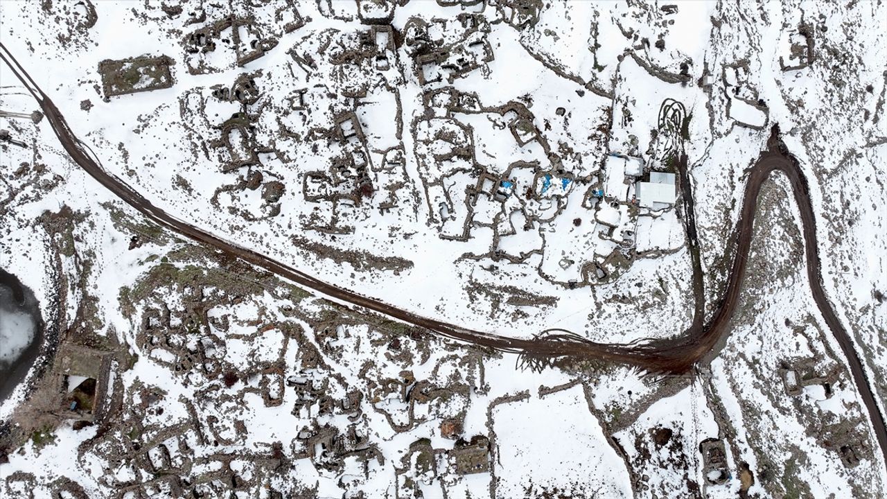 Yaklaşık 2 bin rakımda konumlanan eski yerleşim yeri, birkaç gündür aralıklarla devam eden kar yağışı sonrası beyaz örtüyle kaplandı.