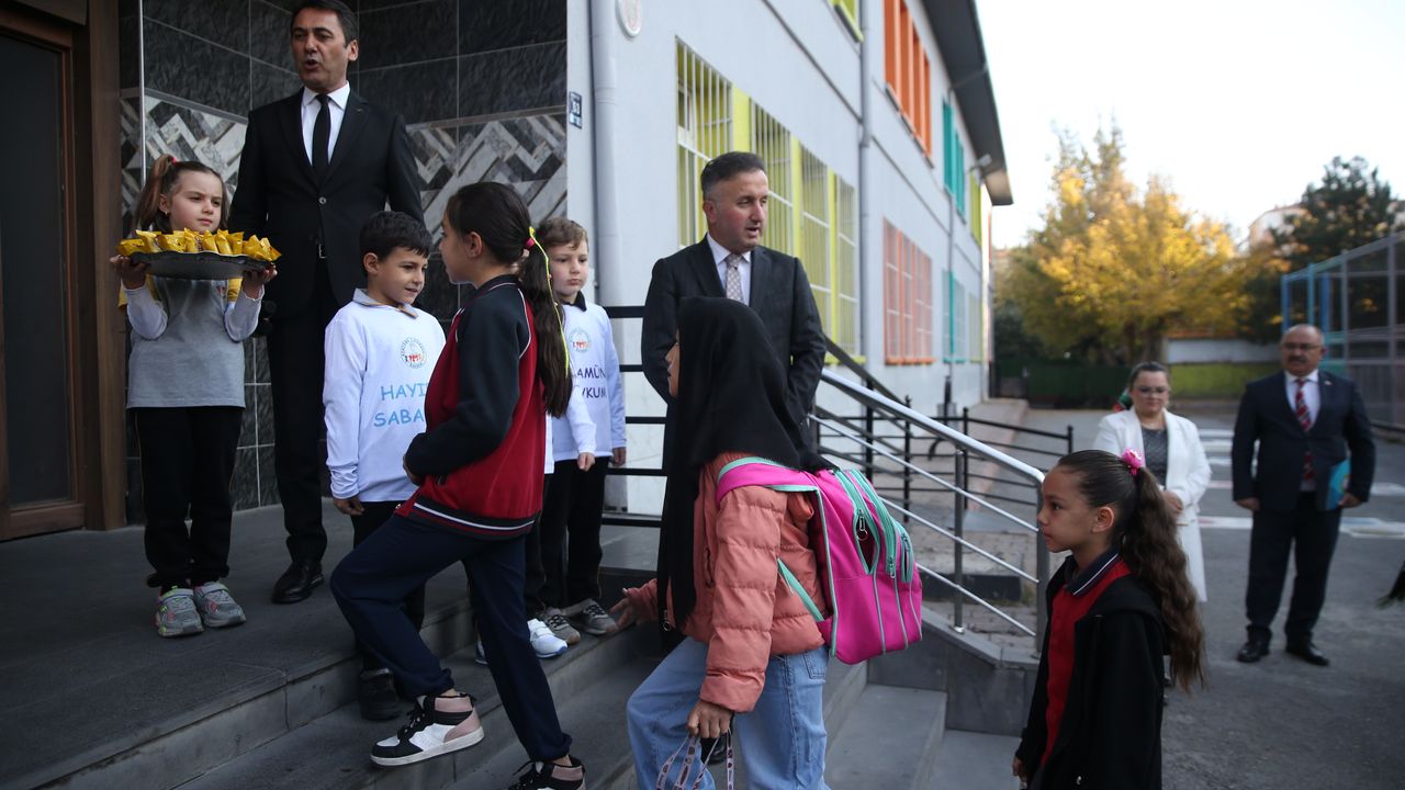 Atatürk İlkokulu'nda düzenlenen etkinlikte minik öğrenciler, üzerlerinde 'Günaydın, 'Hayırlı sabahlar', 'Merhaba', Hoş geldiniz' gibi yazıların bulunduğu tişört giyen arkadaşlarıyla okul girişinde selamlaştı.