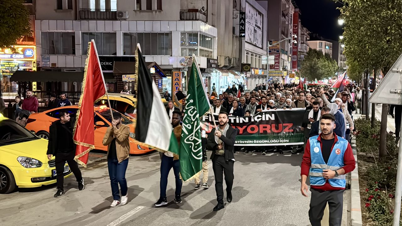 İsrail'in, Küresel Sumud Filosu'na düzenlediği saldırıları protesto eden vatandaşlar, Gazze ve Filistin'e destek sloganları atarak, Cacabey Meydanı'na kadar yürüdü.