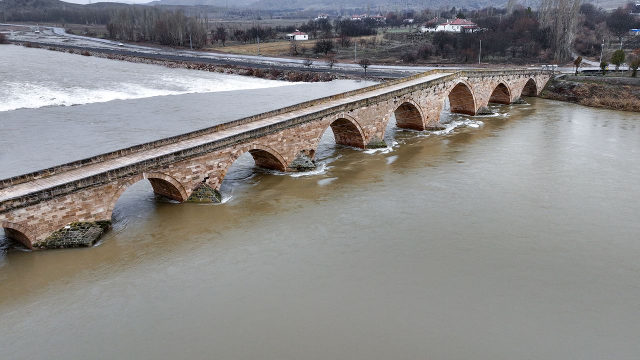 Özellikle yaz aylarında kuraklık nedeniyle sadece birkaç kemerinden su akan köprünün 8 gözü, Kızılırmak'ın debisinin yağışlar ve kar sularının etkisiyle artmasıyla suyla doldu.