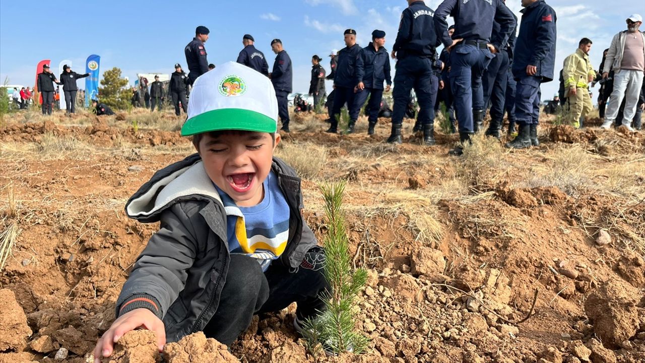 Konya'da Meram ilçesi Dere Mahallesi Belenbaşı mevkisinde düzenlenen etkinlikte, yüzlerce öğrenci, kolluk kuvvetleri, birçok dernek ve STK üyesi fidanları toprakla buluşturdu.