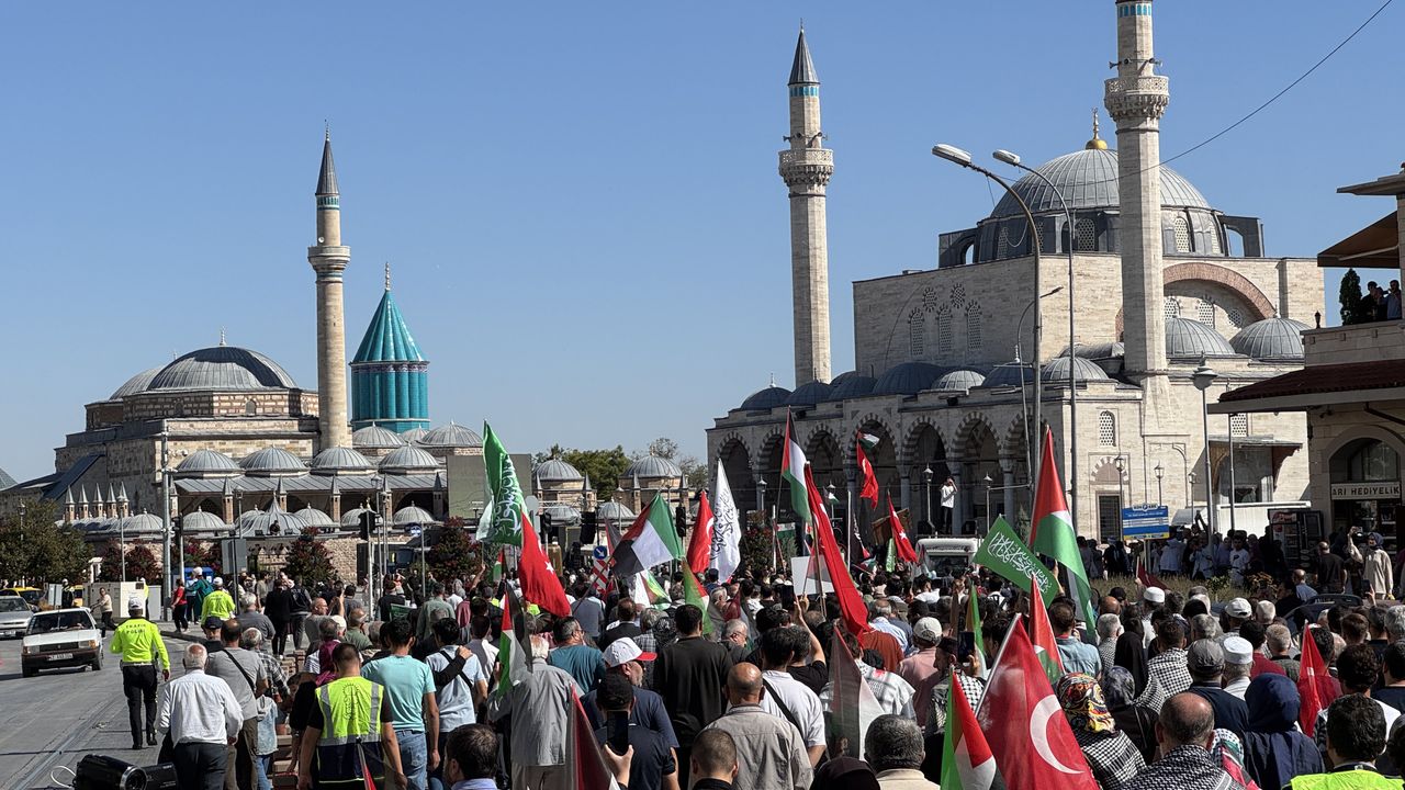Ellerinde bayrak ve pankartlarla Mevlana Meydanı'na yürüyen kalabalık, İsrail aleyhine sloganlar attı.