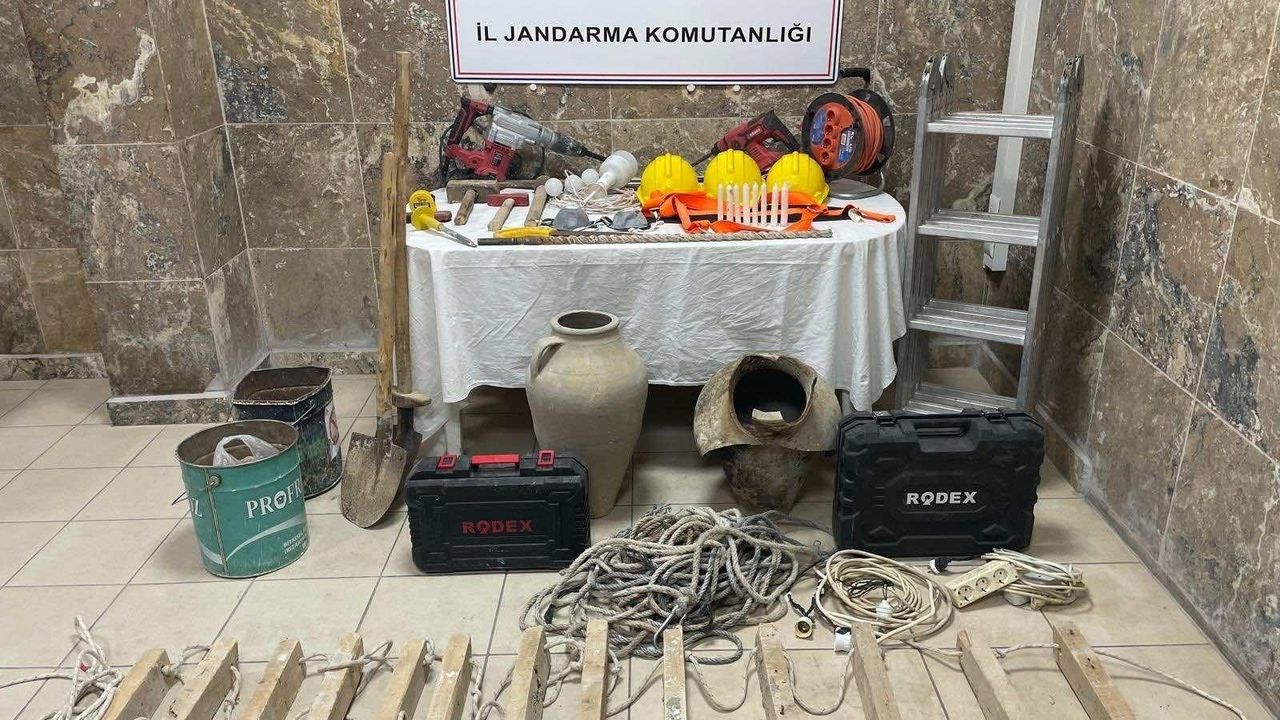 Kaçak kazı yapılan evde, 8 kazı aleti, 2 hilti, 7 farklı ebatta hilti ucu, 4 merdiven, 21 aydınlatma malzemesi ve 3 baret ile kazıda kullanıldığı değerlendirilen muhtelif malzemeleri ele geçirdi.