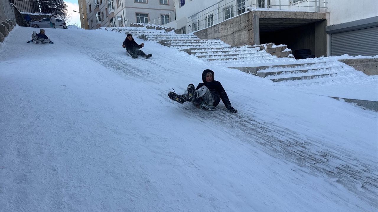 Kentte aralıklarla devam eden kar yağışının ardından bugün okulların tatil edilmesiyle çocuklar, ellerinde naylon poşet ve tepsilerle mahalle aralarındaki yokuşlarda toplandı.